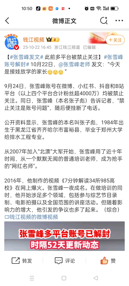 张雪峰全网账号均已解封