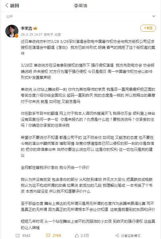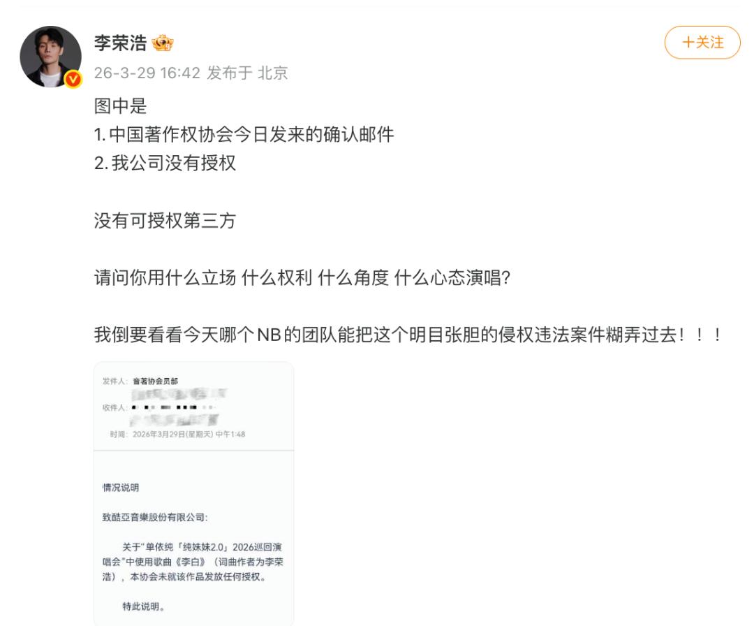2026年3月29日,华语乐坛掀起一场轩然大波。歌手李荣浩在微博发布长文,直指新生代天后单依纯在未获授权的情况下,于深圳演唱会擅自翻唱其代表作《李白》。单依纯随后火速道歉,称“会与团队尽快搞清楚状况”