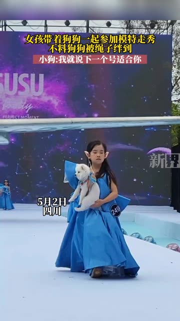 女孩带着狗狗一起参加模特走秀,不料狗狗被绳子绊到,小狗:小狗:我就说下一个号适合你。
