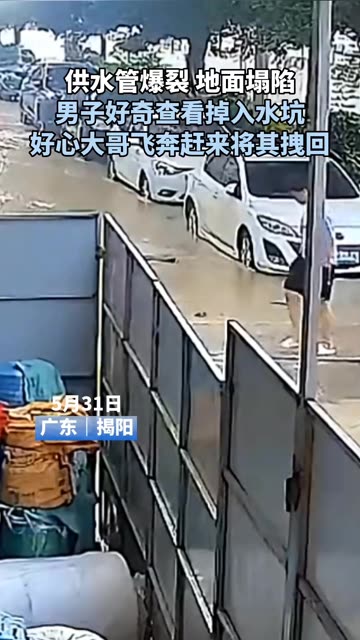 0次播放 | 00:09供水管爆裂 地面塌陷 男子好奇查看掉入水坑 好心大哥飞奔赶来将其拽回