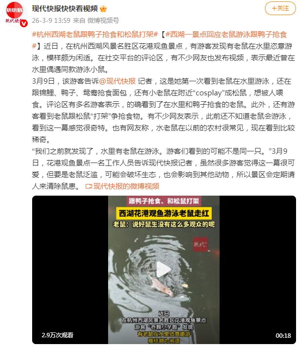 近日,不少游客在杭州西湖景区“花港观鱼”的水中,看到了老鼠下水与观赏鱼“抢食”的场景,有人还将视频发到网上引发讨论。有网友留言称,没想到老鼠还能和观赏鱼、鸭子一起“秀泳技”。3月10日,杭州西湖风景名