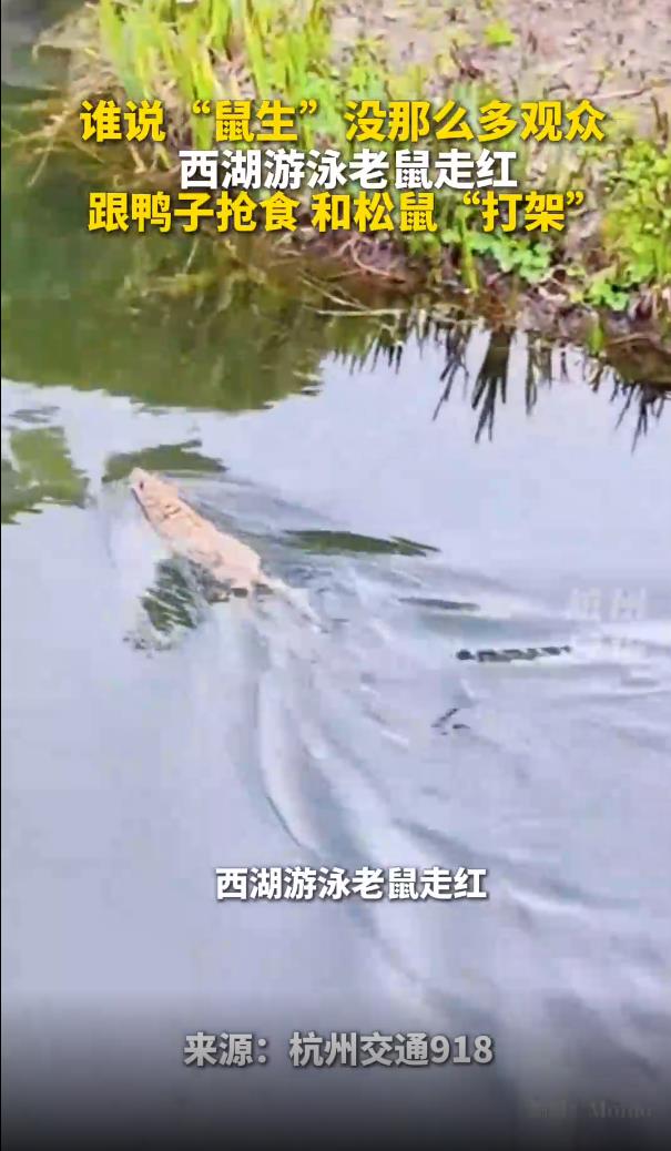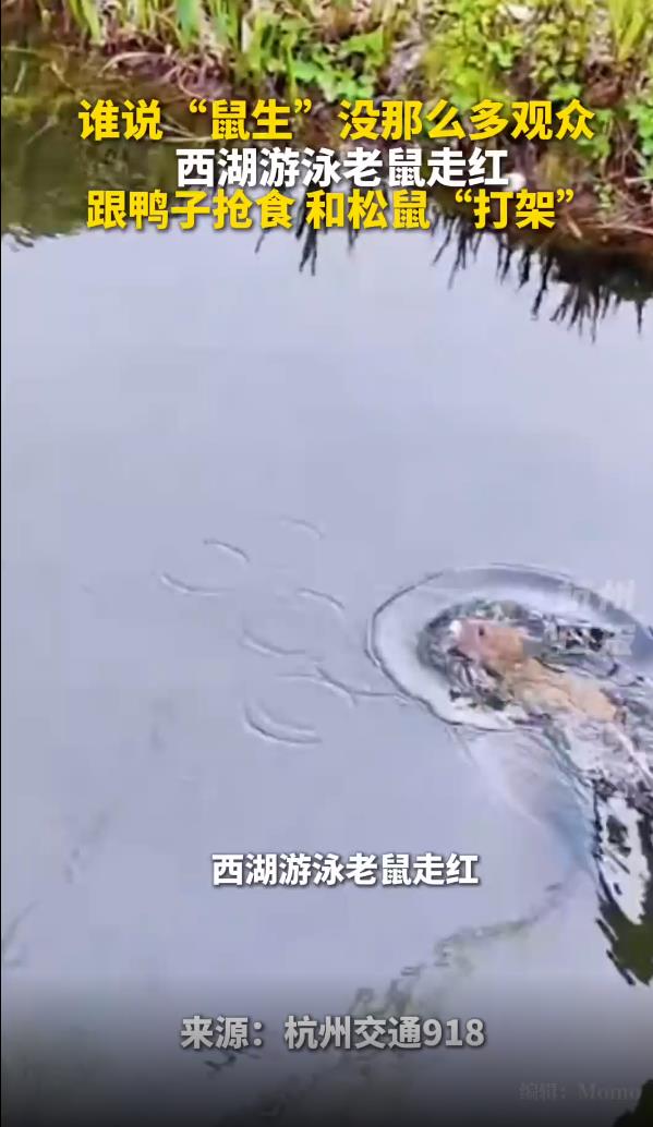 老鼠竟在西湖游泳“打劫”观赏鱼,除了锦鲤和鸳鸯,还有谁在水里抢食?