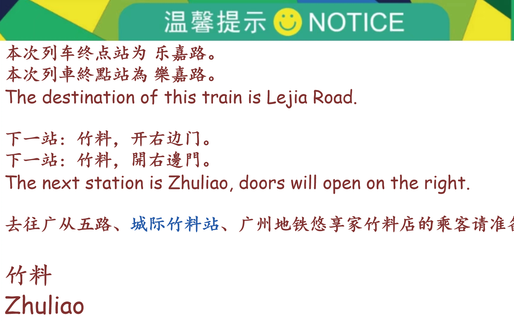 27次播放 | 02:32广州地铁14号线(乐嘉路方向)竹料报站(机器风格)