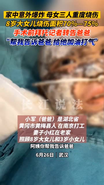 家中意外爆炸,母女三人重度烧伤。母亲全身烧伤80%-90%,至今还在ICU接受治疗,医生说即便...