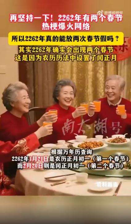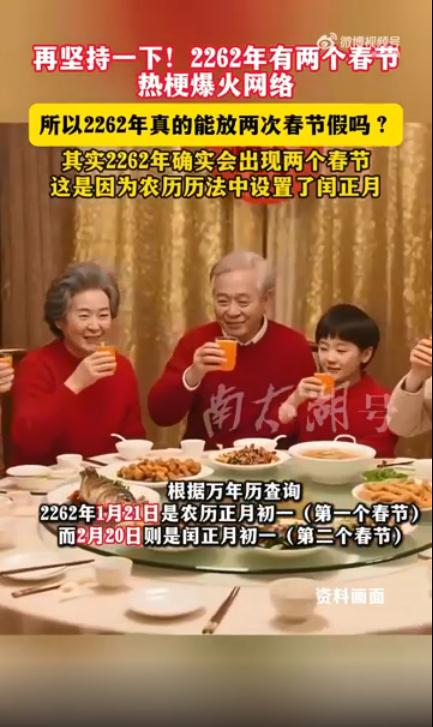 12月18日,话题#再坚持一下 2262年有两个春节#引发热议。根据万年历查询,2262年1月21日是农历正月初一(第一个春节),2月20日是闰正月初一(第二个春节),这种闰正月现象十分罕见。2262