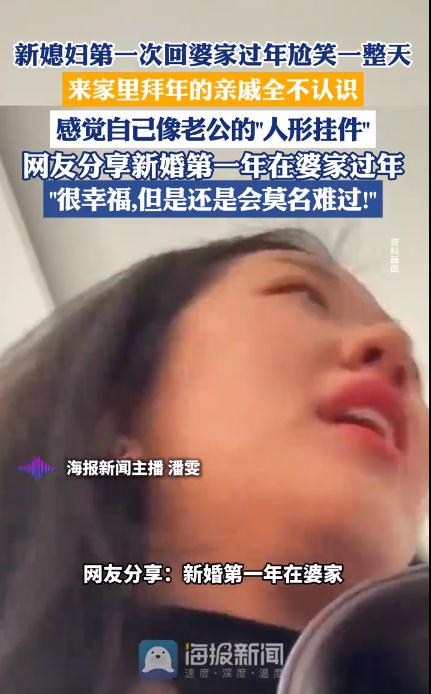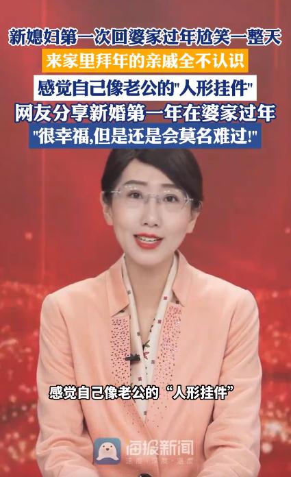 2月17日,大象新闻发的一条视频戳中了不少人的心。视频里,一位新婚第一年回婆家过年的姑娘,记录下了自己真实的一天:面对满屋子叫不上名字的亲戚,她全程只能保持一种僵硬的微笑。她自嘲像个挂在丈夫身上的“人