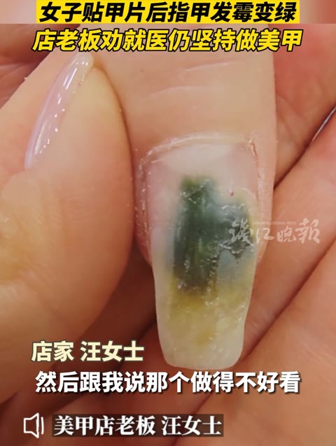 女子贴甲片后指甲发霉变绿,店老板劝就医仍坚持做美甲!