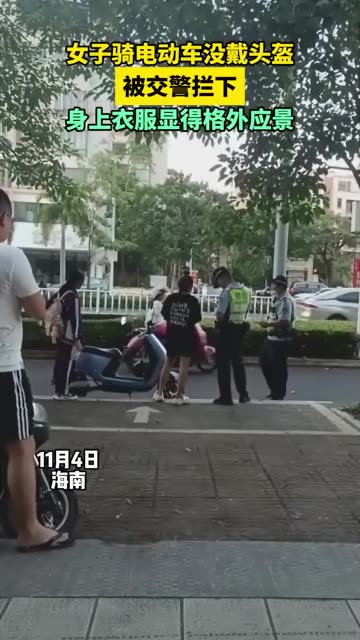 女子骑电动车没戴头盔被交警拦下 身上衣服显得格外应景