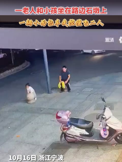 一老人和小孩坐在路边石墩上,一辆面包车失控撞飞二人后