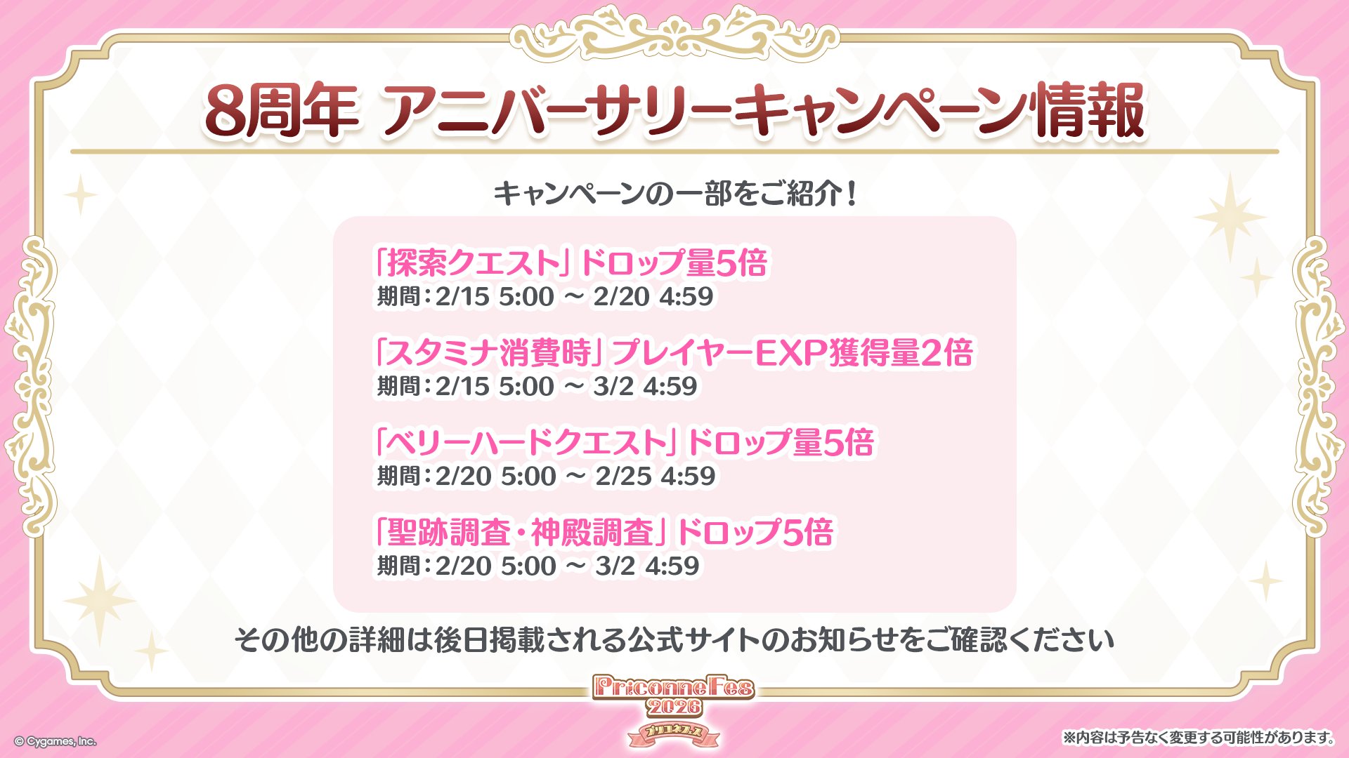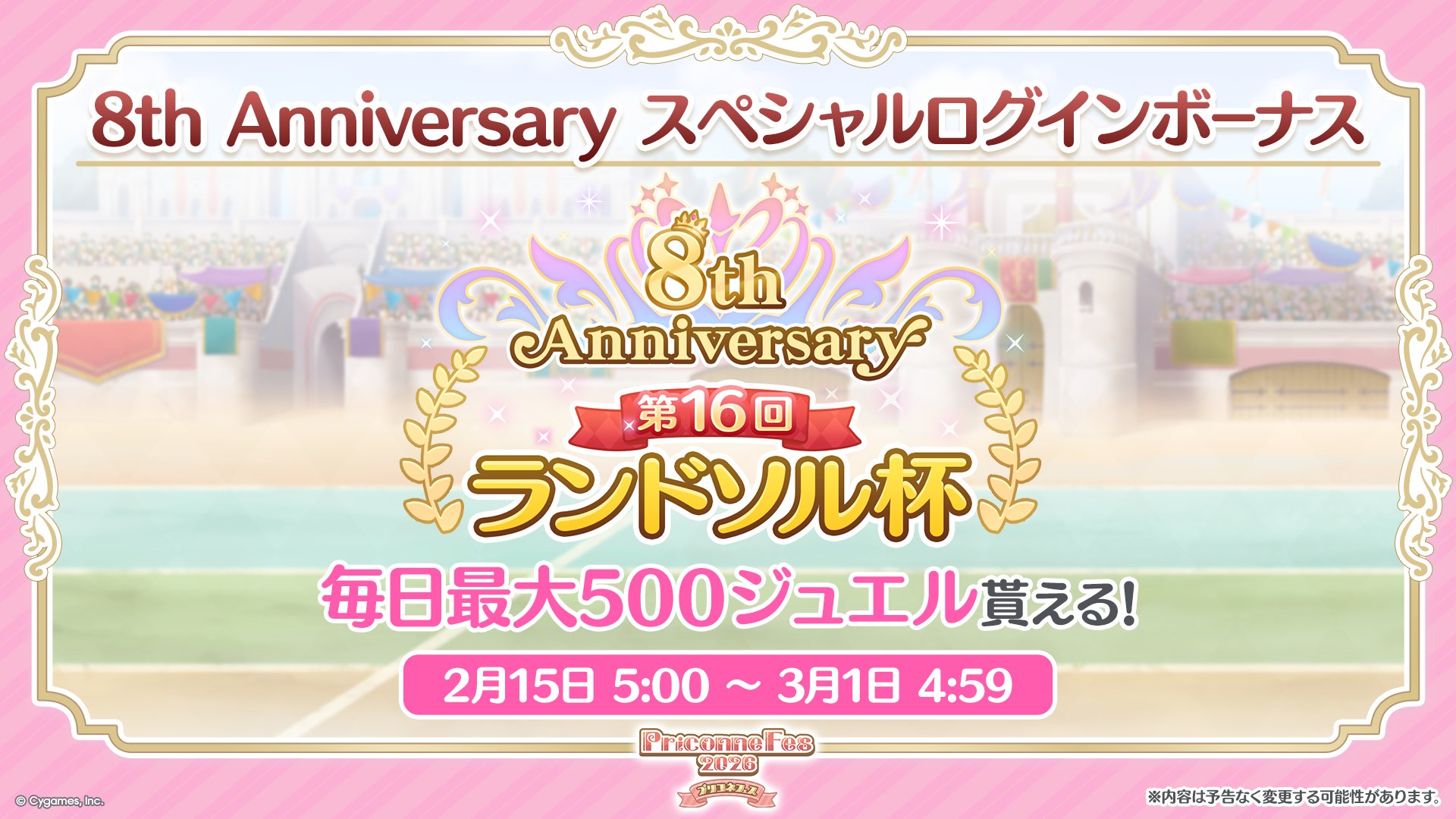 2026.2.15,《公主连结!Re:Dive》(日服)运营满8周年。注意:• 均为北京时间。• 如无注明,以4:00日替计算一天,例如“2.15 - 2.28”指“2月15日4:00至3月1日4:0