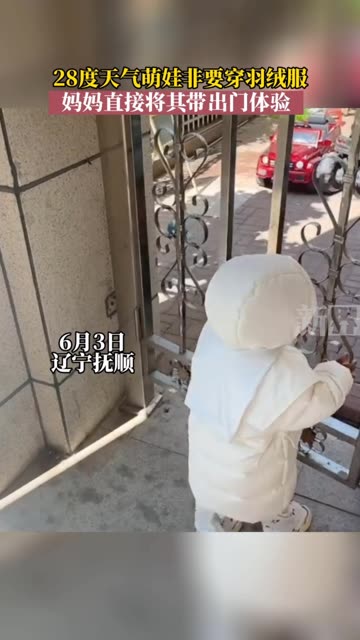 28度天气萌娃非要穿羽绒服出门,妈妈直接将其带出门体验。