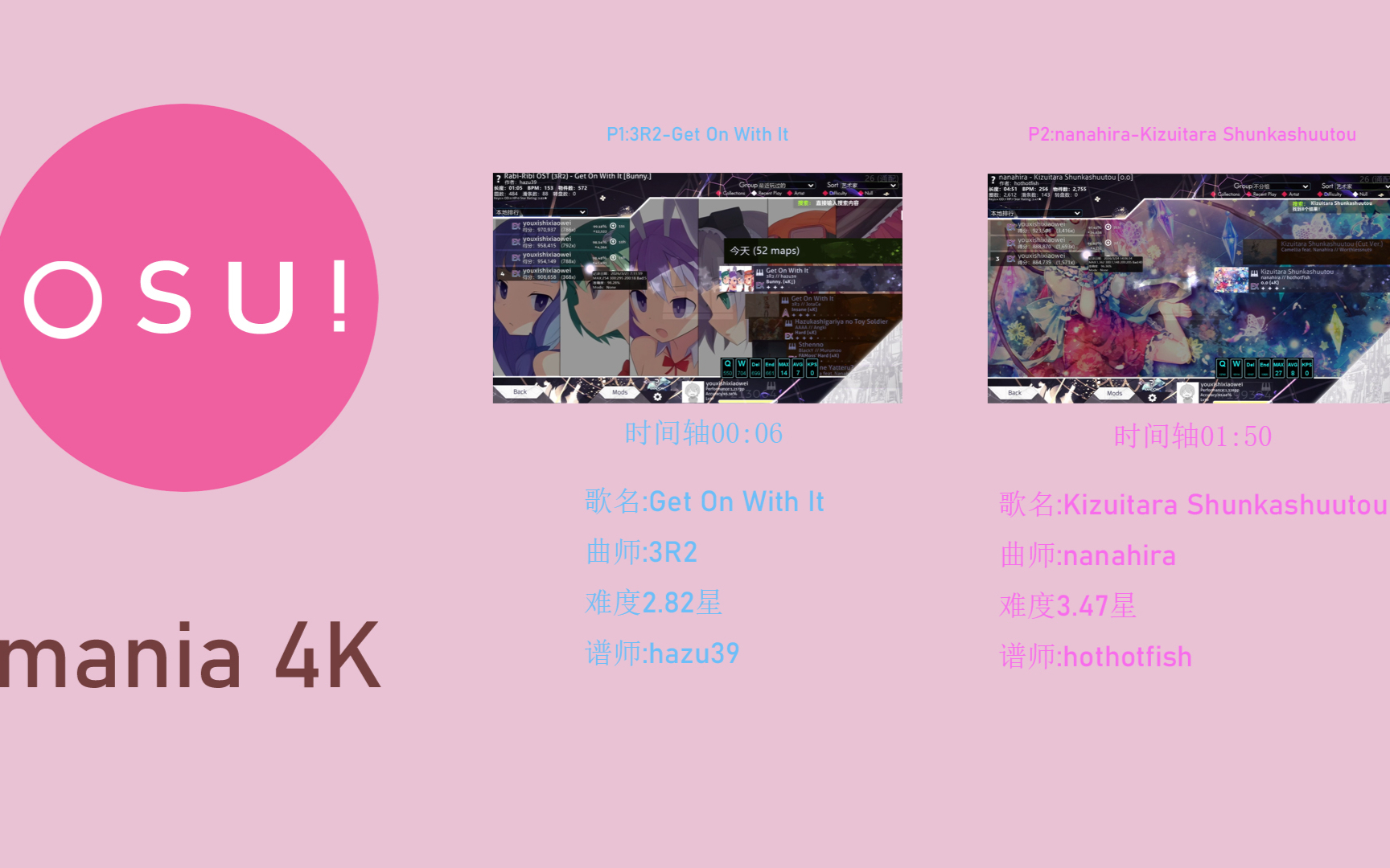 4465次播放 | 08:43【OSU!/mania】P1:3R2-Get On With It,P2:曲名写不下放简介