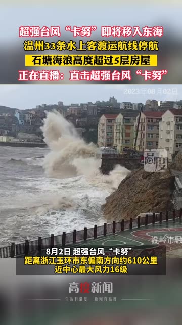 超强台风“卡努”即将移入东海,温州33条水上客渡运航线停航,石塘海浪高度超过5层房屋。