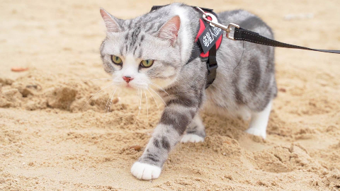 猫咪第一次去海边,就大胆的在沙滩上漫步,表情超霸气