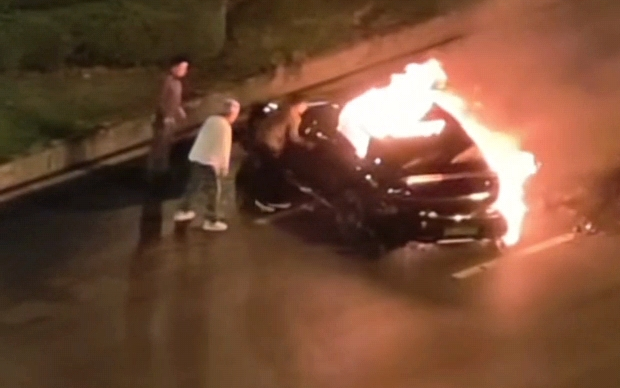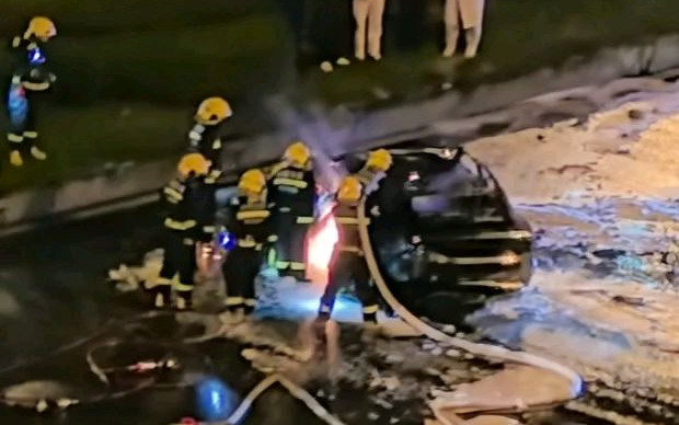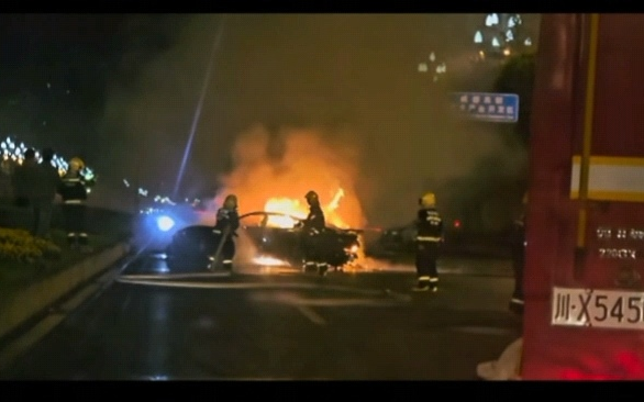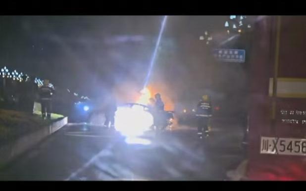 小汽车超速撞车,电池爆燃