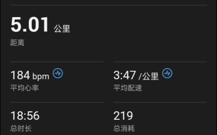 2公里9分29秒平均心率151平均配速4分44热身+5公里18分55秒平均心率184平均配速3分47