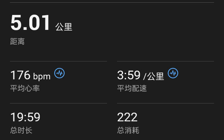 5公里19分58秒平均3分59秒平均心率176