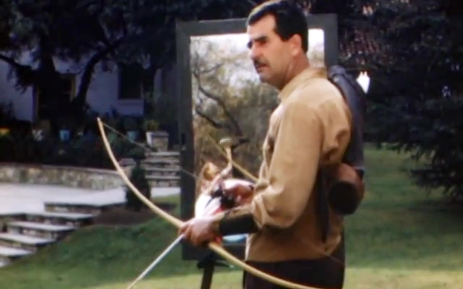 霍华德·希尔通过镜子里的倒影射箭
