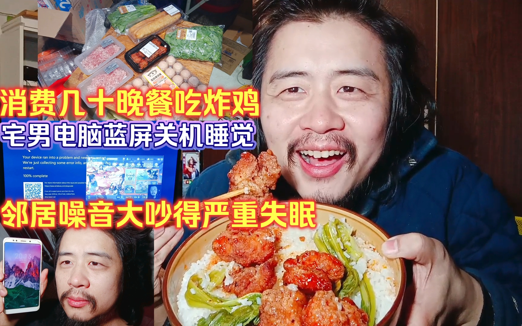 宅男电脑蓝屏关机睡觉,邻居噪音大吵得严重失眠,消费几十元晚餐吃炸鸡