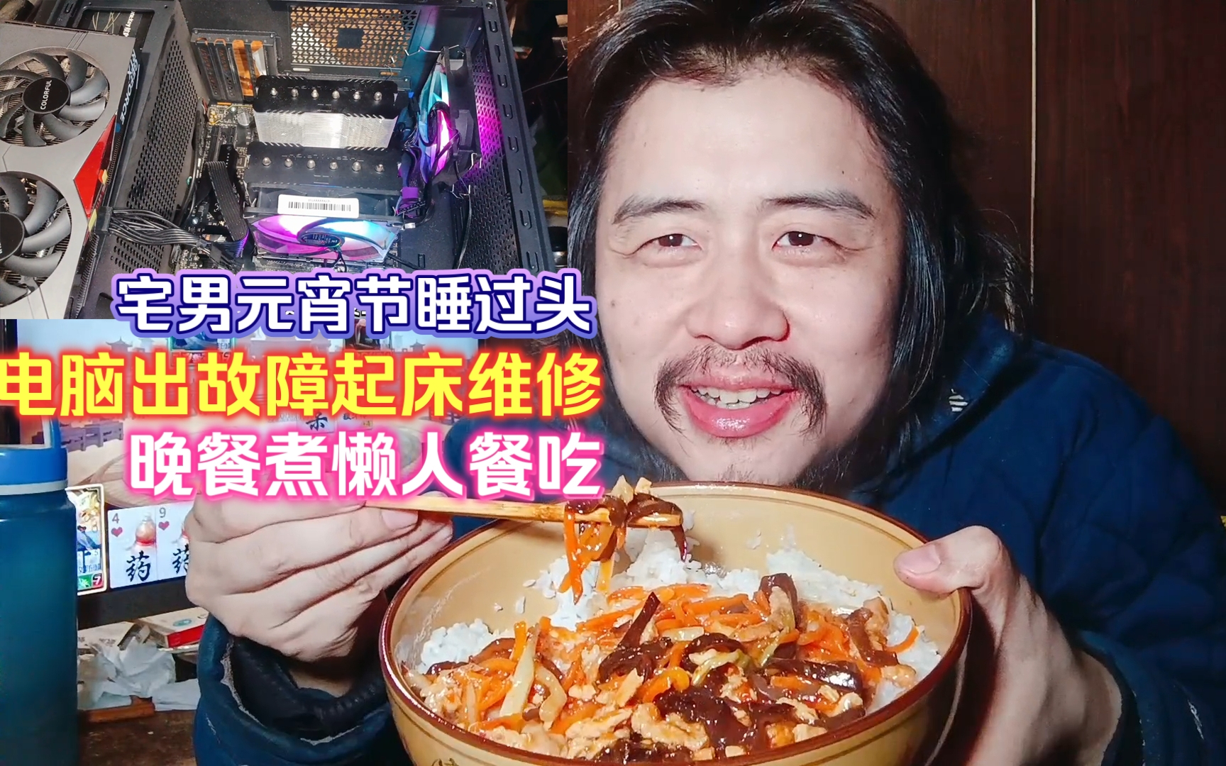 宅男元宵节睡过头,电脑出故障起床维修,晚餐煮懒人餐吃鱼香肉丝盖饭