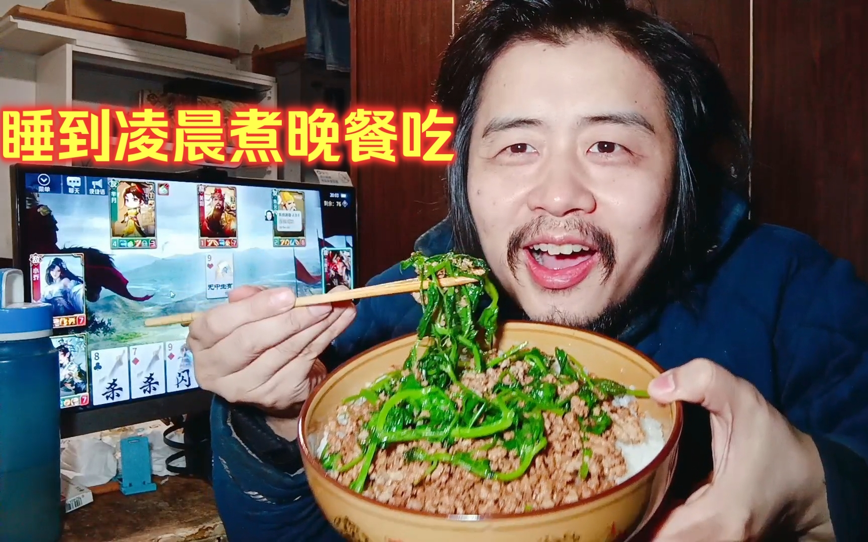 宅男通宵直播玩生化危机9蓝屏死机,煮懒人餐吃鸡蛋汽水肉菜心米饭